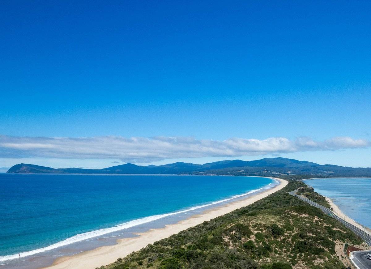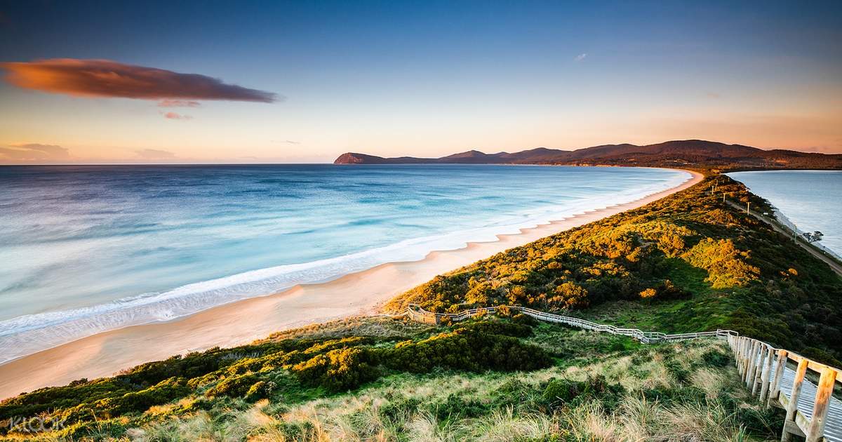 穿过霍巴特市区南行,抵达轮渡码头乘坐轮渡20分钟后抵达布鲁尼岛,沿着海岸线行驶,穿梭于森林间,前往著名的南北一线,这条狭长的小径双月湾The Neck)如同细线一般将布尼岛的南部和北部链接起来,登上楚格尼尼公主瞭望台两侧都是一望无际的大海。这里也是企鹅归巢的栖息地。
